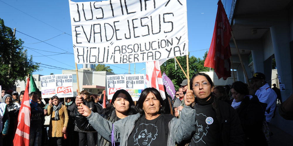 Bajo una bandera enorme que decía “Atacada por Lesbiana. Presa por defenderse” y con un dibujo de Higui jugando al fútbol en el centro, la Asamblea Lésbica Permanente –nacida en la Ciudad de Buenos Aires a partir de este caso- ocupó el centro de la escena. “Para nosotras Higui es un símbolo de una lucha contra la justicia patriarcal. Es la visibilización de lo que nos pasa a las mujeres por defendernos: terminamos presas”, señalaron mientras desde un megáfono, y en medio del sonido constante de los bombos, todos los presentes cantaban: “Yo sabía, yo sabía, que a los violadores los cuida la policía” y “Para la Higui, la libertad. Y que se acabe la justicia patriarcal”.