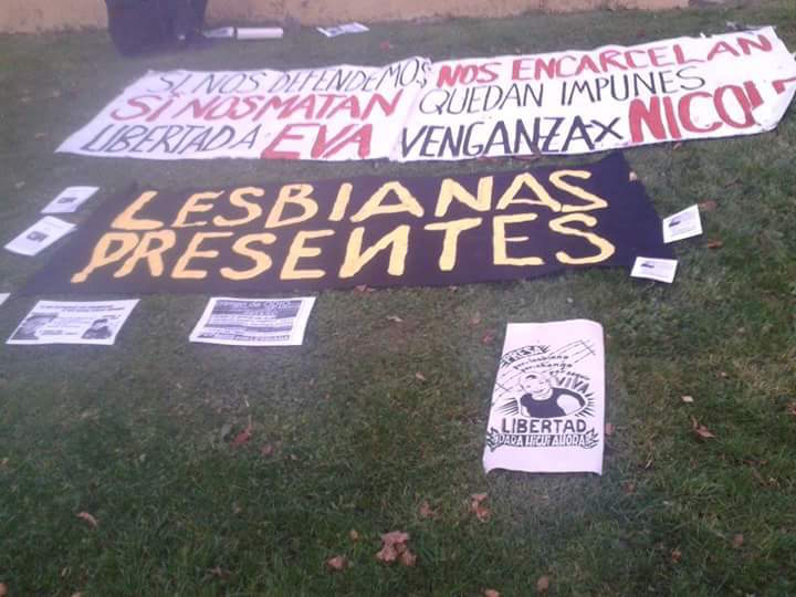 Al frente, dos de las chicas llevaban una bandera negra con letras amarillas que decía “Lesbianas visibles”, mientras el resto de las compañeras repartían panfletos que relataban ambos casos. A Higui y a Nicoles las atacaron por lesbianas, por ser visibles, por pobres, por existir y resistir en esta sociedad heteropatriarcal clasista. Nicole no pudo defenderse de sus agresores. Higui lo hizo y es una sobreviviente que hoy está presa.