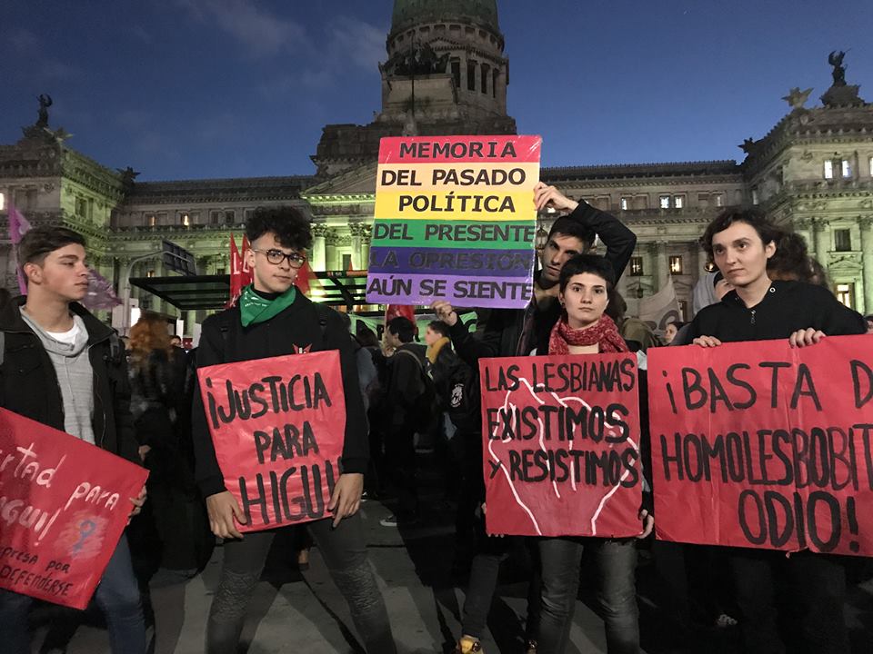 Entre la prensa que fue a cubrir la movilización hubo muchos medios nacionales y también internacionales, como la agencia de noticias EFE: «Este es un caso que está teniendo mucha resonancia no sólo en la Argentina sino más allá, porque es un caso único en el mundo. Y en el día y la semana de la Diversidad Sexual nos parece importante difundirlo», dijo a Presentes la corresponsal española Marina Guillén. El primer grito de “Libertad para Higui” en el Congreso terminó pasadas las 20 y quedó inmortalizado por una foto de la revista “La Garganta Poderosa” que reunió a los manifestantes y los retrató en el gesto que ya es un clásico de la publicación y que se verá en el próximo número. ]]>Somos Presentes