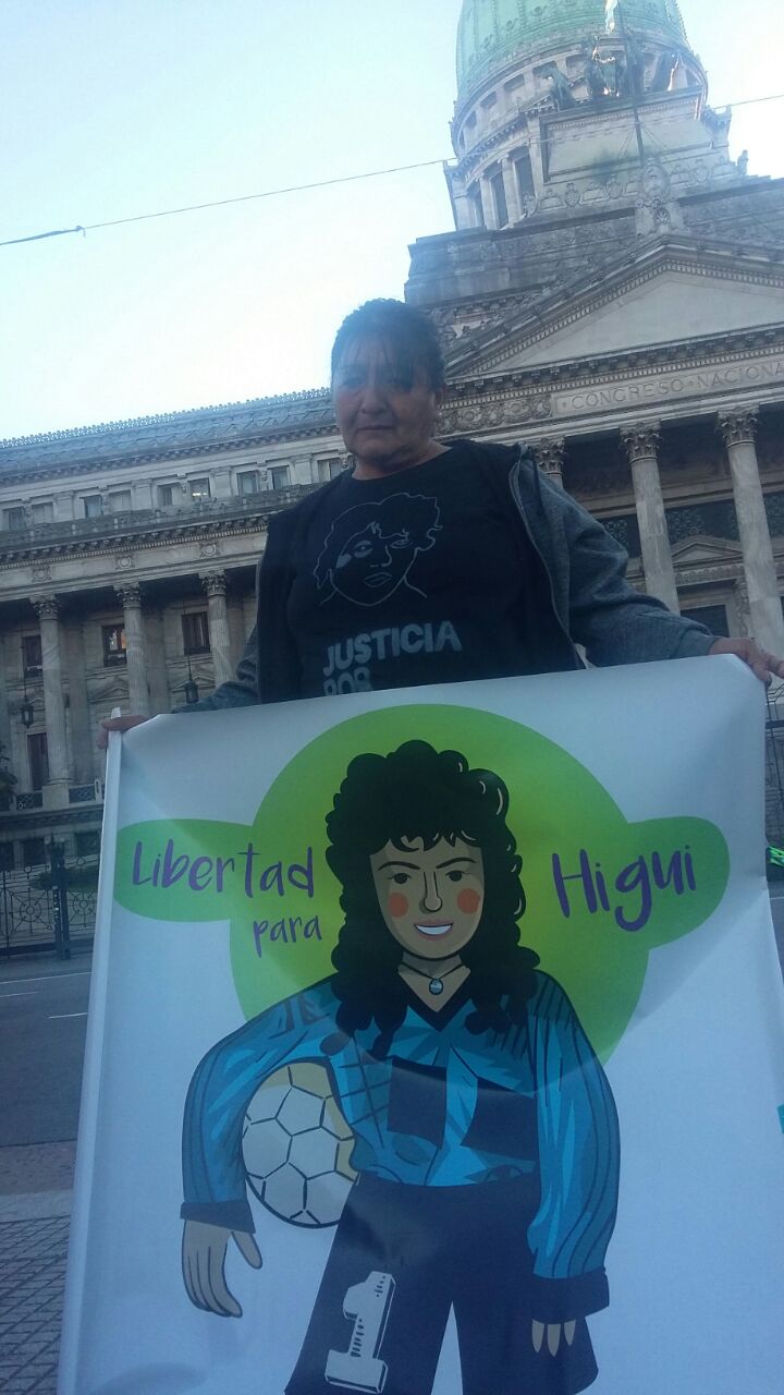 Una de las primeras en llegar a la Plaza de los Dos Congresos durante la jornada nacional que se realizó ayer en distintos puntos del país para pedir la liberación y absolución de Eva Higui de Jesús, fue su madre. A las 17 en punto, hora de convocatoria de la movilización en Buenos Aires, con una remera negra con la cara de su hija impresa, Susana Díaz se paró sola, de espaldas al Congreso de la Nación. Sostenía una bandera con la imagen de Higui que en estos días recorre las redes sociales: el pelo largo, vestida de jugadora de fútbol, una pelota bajo el brazo y sonriente.