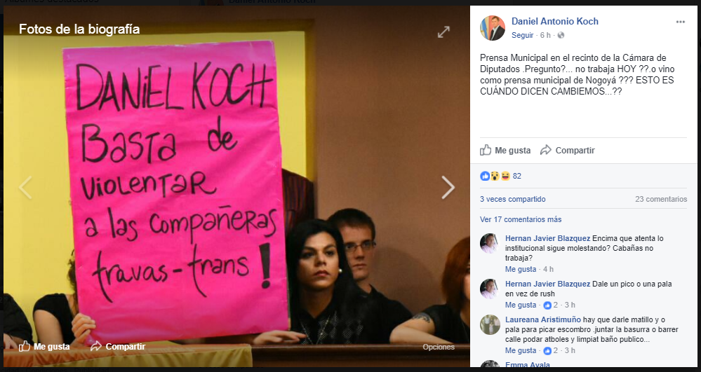 El 11 de noviembre la ciudad entrerriana de Paraná tuvo su Marcha del Orgullo. Y la activista y dirigente trans Keili González, que además es la encargada de prensa de la Municipalidad de Nogoyá, fue una de las que encabezó la movilización con el torso desnudo y pintada. De inmediato, el diputado del Frente Renovador Daniel Antonio Koch, salió a criticarla con argumentos discriminatorios y además violó la Ley de Identidad de Género: “Lautaro González o Keili, como la quieran llamar, tuvo el tupé de encabezar esa marcha, cuando fue el Estado entrerriano quien invirtió en hacerle los pechos, para que en un acto totalmente repudiable, los muestre mientras caminaba encabezando esta marcha”, dijo el legislador, que pocos días después fue denunciado ante la Subsecretaría de Derechos Humanos de la provincia y el INADI.