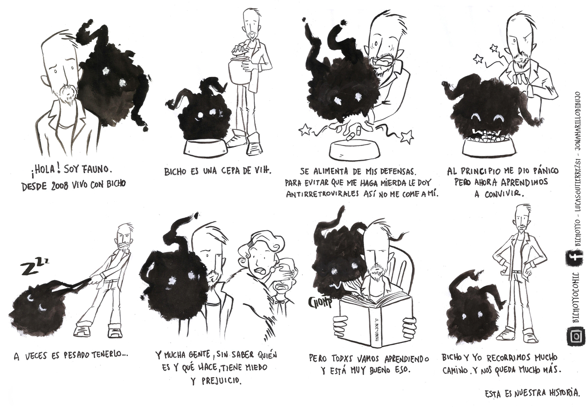 "Hola! Somos Fauno y Bicho. Desde 2008 que vivimos juntos. Bicho es una cepa de VIH y vive conmigo". Así arranca "Bicho y yo", la tira que cuenta en primera persona y sin prejuicios cómo es andar por la vida con el virus. Con guión de Lucas Fauno Gutiérrez e ilustraciones de Jon Amarillo, busca darle un tono menos solemne a un debate que a veces de tan cuidado queda invisibilizado o lejano a la realidad.