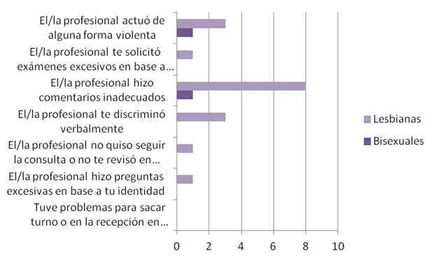 Más de la mitad de las lesbianas informó algún tipo de violencia. Mayormente verbales, en forma de “comentarios inadecuados”, pero también discriminación verbal explícita. Algunas más dijeron que le profesional actuó de alguna forma violenta, o que solicitó exámenes excesivos en base a su identidad, o que se negó a seguir la consulta o revisarla.