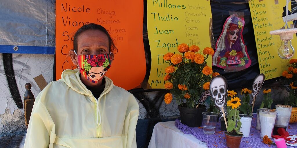 Esther, quien también es fundadora de esta ofrenda, cuenta que Jaime Montejo “dio la vida por muchas de nosotras para que tuviéramos que comer durante esta pandemia”. Jaime murió por covid-19 el 5 de mayo.