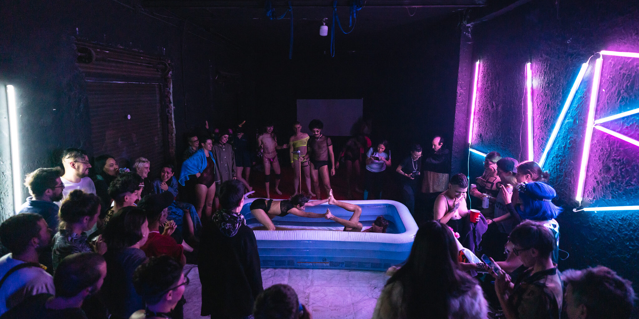 Dentro de este espacio, el lubricante es el poder, se convierte en un protagonista. Sin él los desmadres serian graves para lxs cuerpas que lo dan todo dentro de la piscina. La viscocidad hace que los golpes se deslicen, silencia las caídas. Los brazos resbalan al tratar de sostener al otrx, lxs luchadorxs se retuercen como si se estuvieran exorcizando. Eso si, en todo momento hay un acuerdo mutuo entre lxs marranxs, un pacto de cuidado.