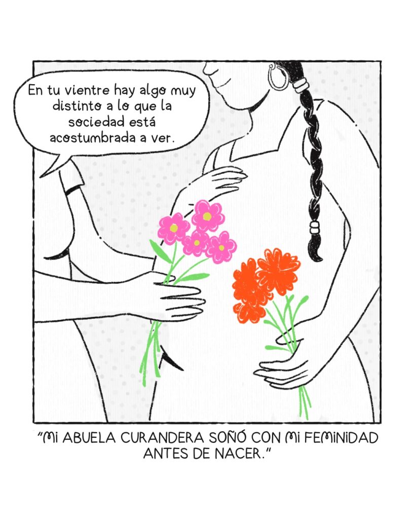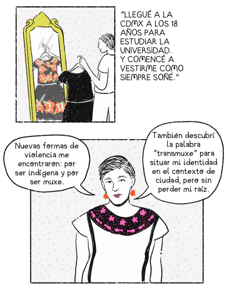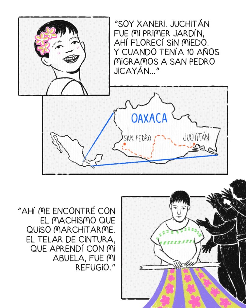 Creció como una niña muxe en el Istmo de Tehuantepec. En la ciudad conoció la violencia machista y se nombró transmuxe. En todos lados es Xaneri, la que teje con sus ancestras y vive su identidad sin categorías fijas, acuerpando infancias y adolescencias diversas.