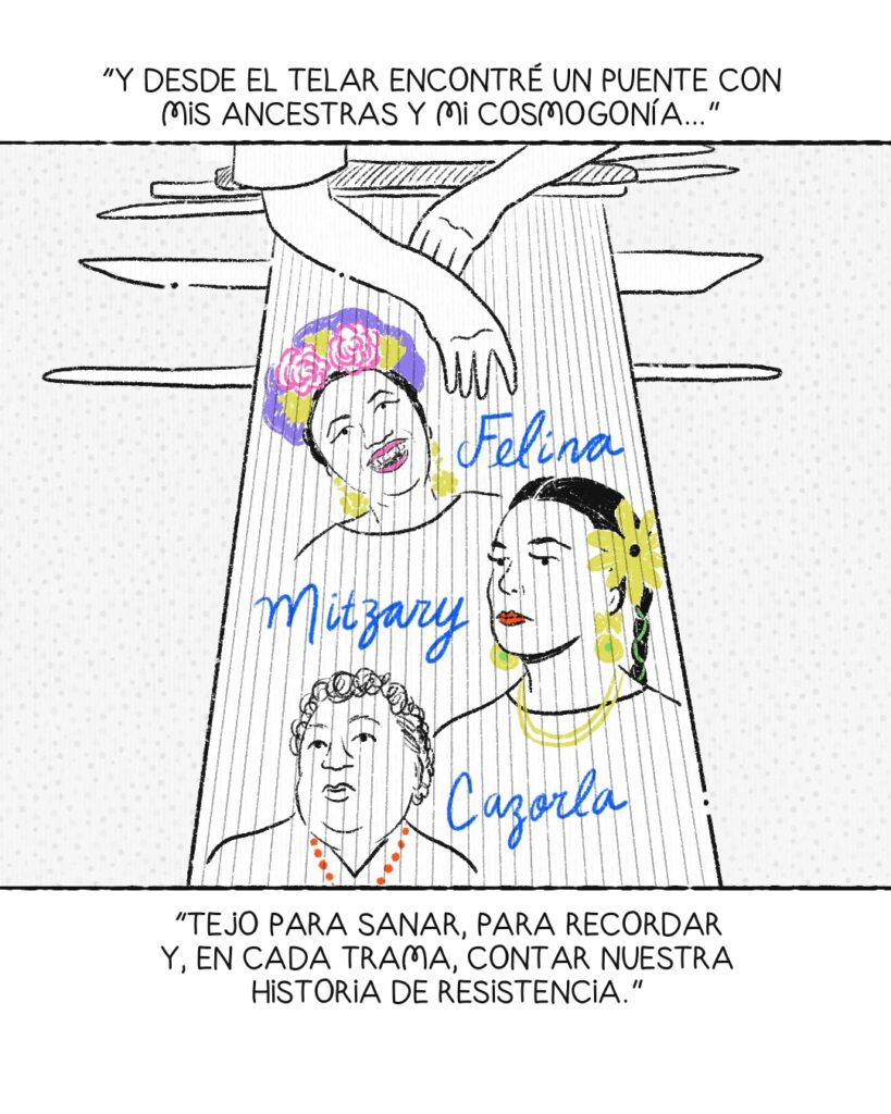 Una parte esencial de su vida es el telar de cintura, que aprendió de su abuela mixteca. Para ella, tejer es más que un arte: es una forma de sanar, narrarse, conectar con sus ancestras y resistir. Sus tejidos cuentan historias de dolor, gozo y dignidad.