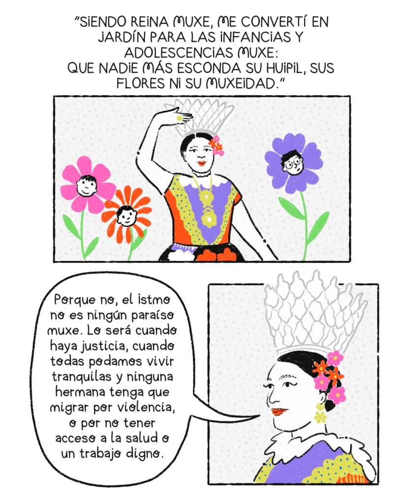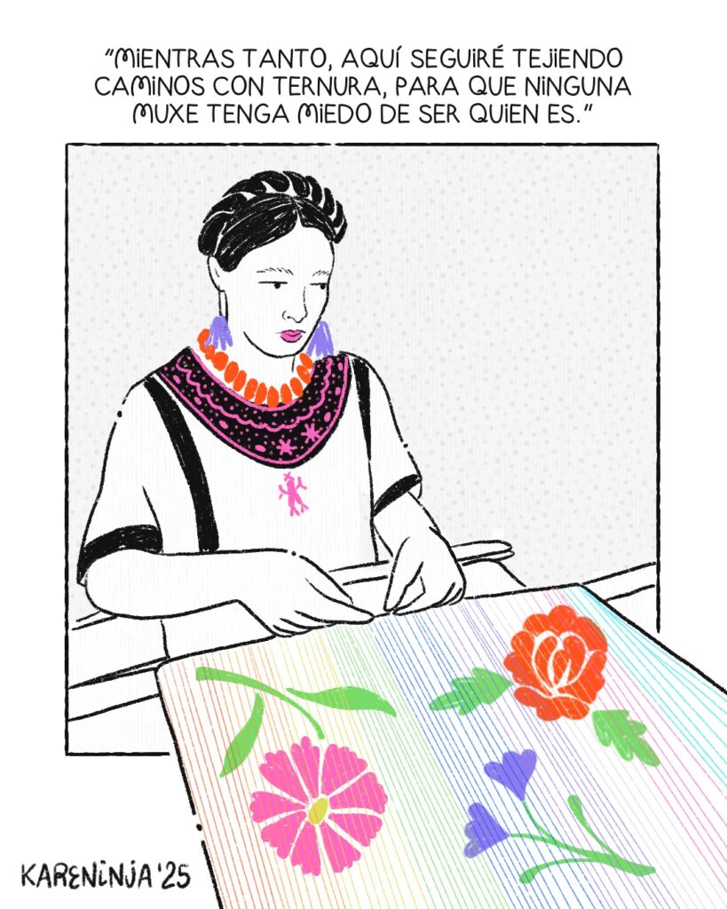 Hoy acompaña a infancias y adolescencias muxes. Se ofrece como “un jardín” donde otras puedan crecer y florecer sin miedo, usando huipil y mostrando su feminidad. Cree en la ternura como política radical, como forma de sanar, resistir y acuerpar.Por su labor de cuidado y visibilización, fue coronada Reina Muxe en Oaxaca (2023) y en la CDMX (2024). Este 5 de julio entregó su corona. Su compromiso continúa: sigue siendo una guía y un refugio para que otras puedan vivir su muxeidad con dignidad, orgullo y amor.