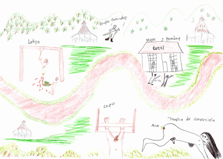 Sentado frente a la iglesia central del municipio de Tierralta, a pocos metros del río Sinú, Leo comienza a desbordar el cauce de su memoria. La primera persona que recuerda que fue castigada por su orientación sexual y expresión de género se llama Bella, una mujer embera lesbiana. A Bella primero la metieron en la cárcel de Dozá durante seis meses porque “le gustaba trabajar mucho en el monte, coger el machete y hacer cosas de hombre”, luego la torturaron en el cepo porque vieron que no cambiaba su comportamiento. Según Leo desde el año 2006 las personas lgbt comenzaron a visibilizarse, lo que provocó que los actores armados reunieran a las comunidades y comenzaran a presionar a las autoridades indígenas para que tomaran cartas en el asunto; la respuesta fue ejercer medidas de vigilancia, persecución y represión, para reestablecer el orden moral. Por ejemplo, los grupos paramilitares que han venido haciendo presencia en el territorio coaccionan a las comunidades indígenas a que identifiquen a las personas lgbt para someterlas a castigos correctivos, y si estas no atienden el llamado, estos intervienen mediante prácticas de reclutamiento forzado, incluyendo en algunos casos, la violencia sexual. Otro hombre gay embera comenta: