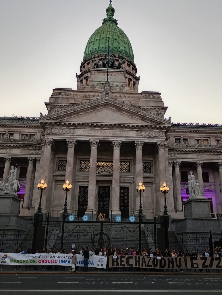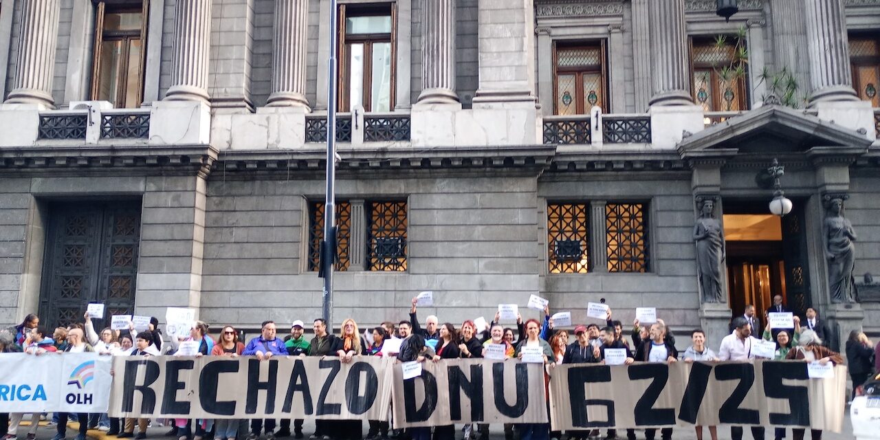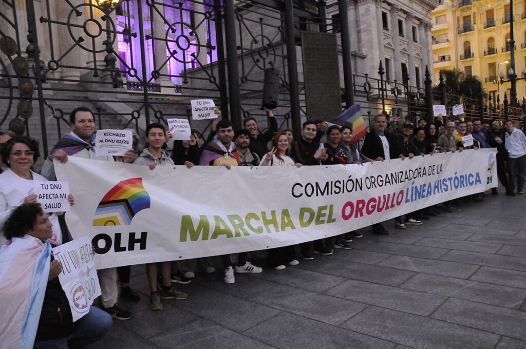 La acción convocada por el Frente Orgullo y Lucha y la Comisión Organizadora de la Marcha del Orgullo – Línea Histórica desplegó un cartel enorme con la inscripción “Rechazo DNU 62/25” en la fachada del Congreso de la Nación, además de la exhibición de carteles con la denuncia: “Tu DNU afecta mi salud”. Personas en moto, colectivos y autos apoyaron la iniciativa y acompañaron con bocinazos.