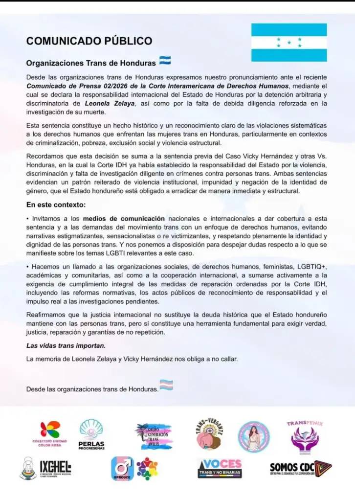 Organizaciónes Trans Honduras enfatizan que la sentencia de la CorteIDH en el caso Leonela Zelaya visibiliza la violencia sistémica contra las mujeres trans en el país, muchas de las cuales son trabajadoras sexuales en extrema vulnerabilidad. El fallo, que reconoce la persecución policial, debe ser el impulso definitivo para una reforma profunda de la Ley de Policía. También debe apuntar a la creación de un protocolo de investigación específico que garantice justicia. La sentencia honra a Leonela y a todas las trans asesinadas en la impunidad; ahora exige acción inmediata del Estado para transformar la discriminación en protección real.