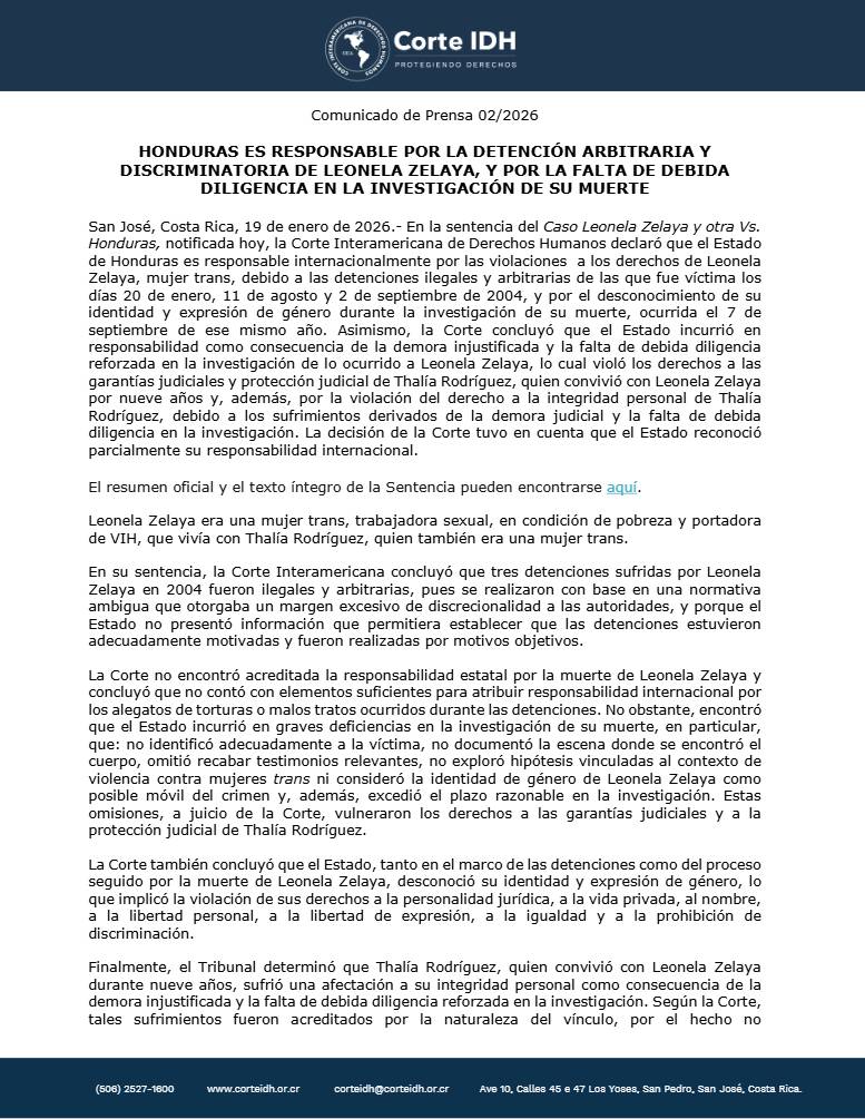 La Corte IDH había emitido el 2 de octubre de 2025 la sentencia de gran alcance que declara la responsabilidad internacional de Honduras por las violaciones a los derechos humanos de Leonela Zelaya, mujer trans trabajadora sexual asesinada en 2004, y de su compañera Talía Rodríguez. La sentencia, notificada formalmente el 13 de enero de 2026, constituye un hito en la jurisprudencia regional sobre violencia por prejuicio de género y los derechos de la comunidad LGBTI+.
