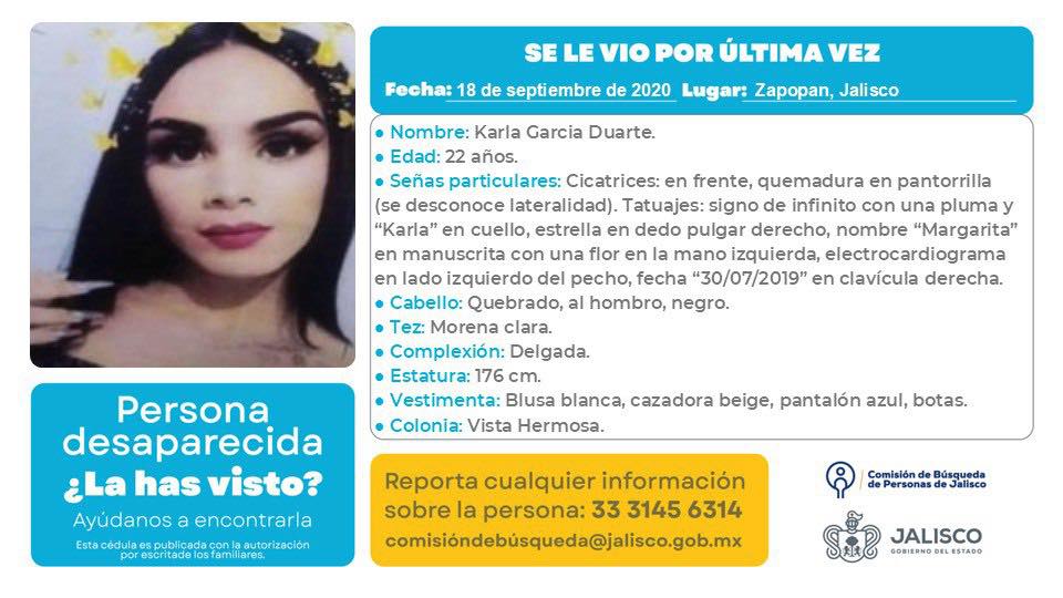 La Fiscalía del estado de Jalisco encontró culpable y sentenció a 100 años de cárcel a Yaneth Miroslava ‘N’ por la desaparición de Kenia Duarte Pérez (20 años) y Karla García Duarte (22 años), dos mujeres trans que fueron vistas por última vez en la ciudad de Zapopan junto a Jaime Ramírez el 18 de septiembre de 2020. Es la primera vez que en México se sentencia a una persona detenida por la desaparición de dos mujeres trans.