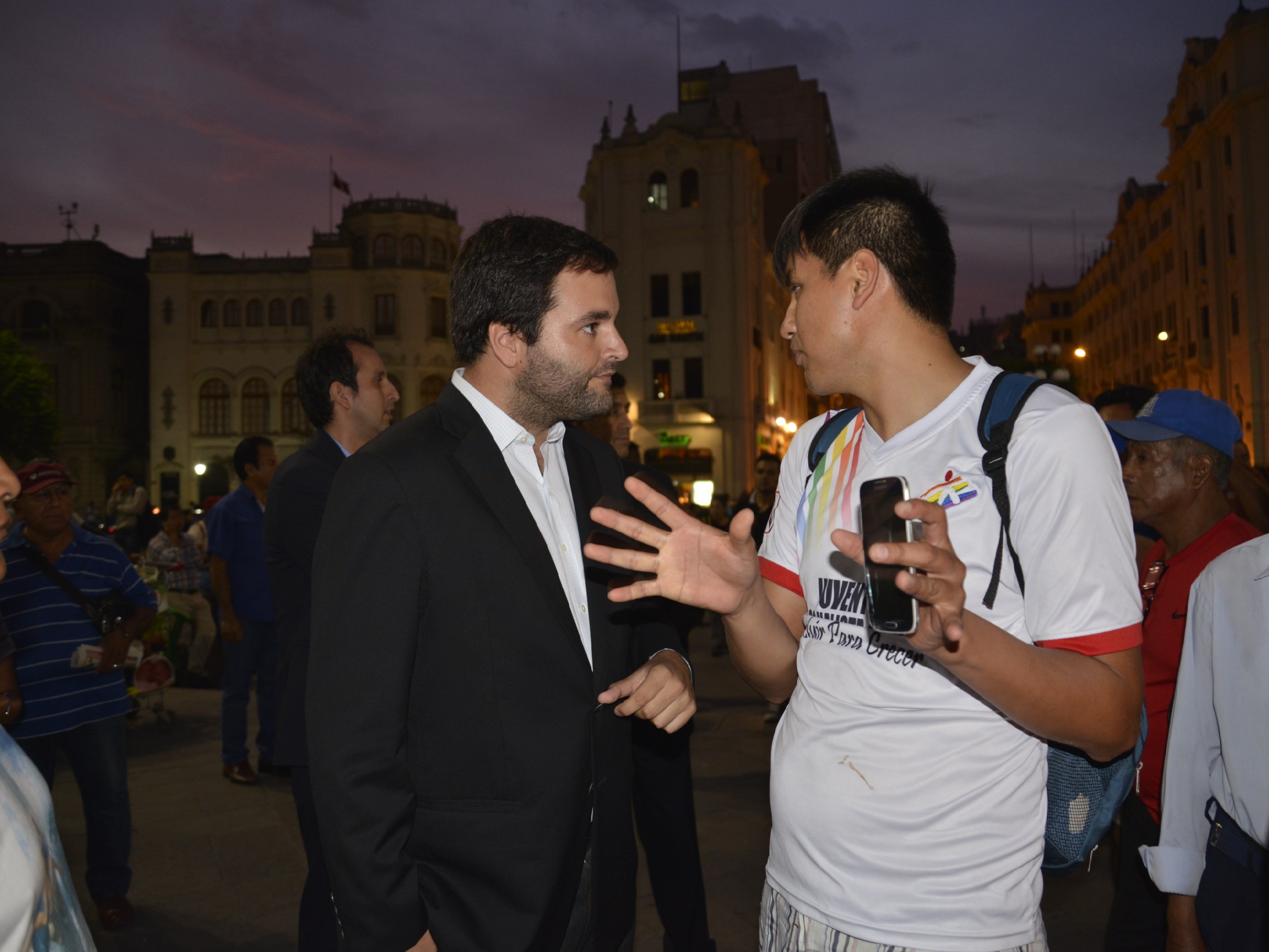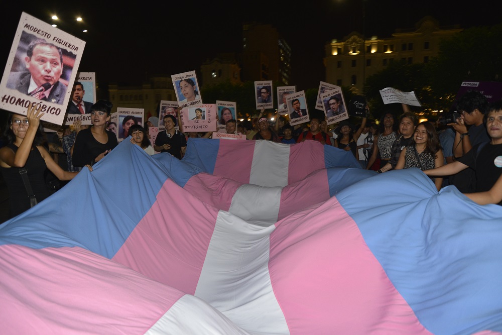 Around seven in the evening, about a hundred people from the LGBT community gathered around a giant rainbow flag, unfurled in the middle of the plaza. They chanted slogans against the Fujimorist congressmen Miguel Torres, Modesto Figueroa, Miguel Castro, Gilmer Trujillo, Úrsula Letona, Karina Beteta, Luis Galarreta, Edwin Vergara, Rosa María Bartra, and Lourdes Alcorta, who voted in favor of the repeal.