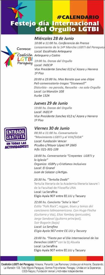 Paraguay has its own National LGBTI Rights Day. It commemorates a letter/manifesto that launched the public struggle for sexual diversity. It was during the dictatorship and 10 years before Stonewall. The LGBTI Coalition joined Pride 2017, organizing a Pride march from the Antequera steps with music and performances. It will take place in September.