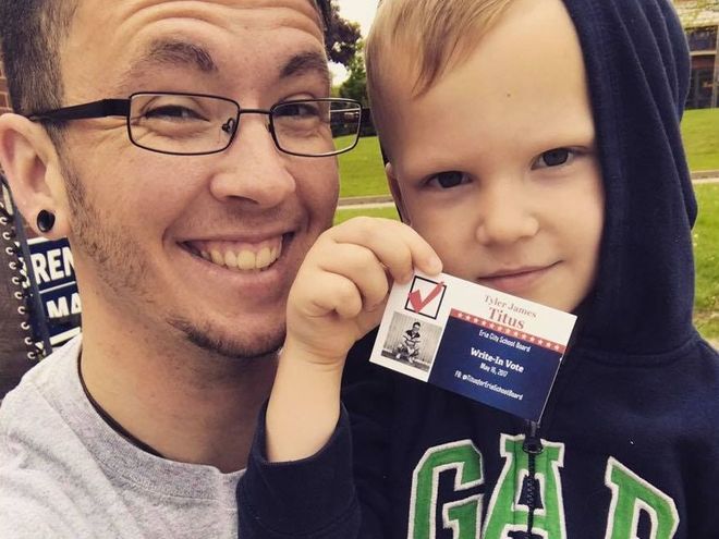 Also in Minneapolis, a transgender candidate, Phillipe Cunningham, was elected president of the city council. In Pennsylvania, another transgender man, 33-year-old Tyler Titus, was elected to the Erie School Board, and in California, Lisa Middleton became the first transgender person elected to public office, taking a seat on the Palm Springs City Council. Tyler Titus, a trans man, during the campaign with his young son.