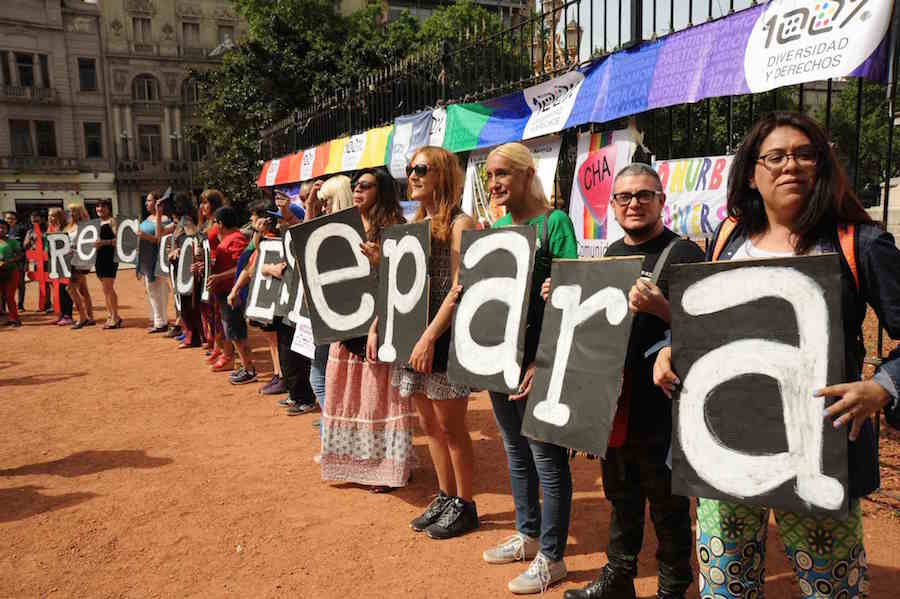 Photos: Ariel Gutraich. On Thursday, November 16, the bill for reparations for transvestites and transgender people who have suffered institutional violence due to their gender identity will be presented in the National Senate. This step forward in the #ReconocerEs Reparar (Recognize Is Repair) campaign aims to pass Bill 8194 into law: to provide a special pension to transvestite and transgender people over 40 years of age who have suffered violence, whether through the application of police edicts or any other degrading act by security forces. Conceived by transvestite leaders Marlene Wayar, Lohana Berkins, and Diana Sacayán, the bill was drafted collectively by several organizations: Abosex, Alitt, Futuro Transgenérico, MAL (Movimiento Antidiscriminatorio de Liberación, created by the murdered transvestite activist Diana Sacayán), Conurbanos por la Diversidad (Suburbanites for Diversity), and has the support of more than 30 LGBTQ+ organizations. It was introduced in the Chamber of Deputies on October 6, 2016, with the signatures of twenty-two legislators. Its progress has been stalled in the Internal Security Committee since early 2017.