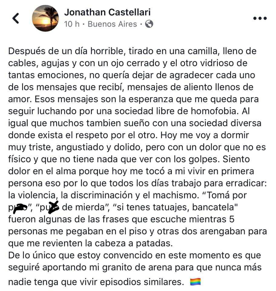 By Lucas Gutiérrez Photos: courtesy of JC and SS (image taken minutes before the attack) Jonathan Castellari, the young man hospitalized following a homophobic attack on Friday in Buenos Aires, has already testified before the court and was discharged this afternoon. He remains shocked, convinced that it was not a…
