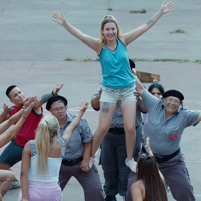 A group of women are playing soccer in the prison yard. Noelia, a trans woman who was forced into a sex trafficking ring, is wearing a Riquelme jersey. What initially seems to be the start of a fight between Noelia and another inmate transforms with the appearance of a catchy rhythm that grows louder and louder. The confrontation evolves into a choreographed routine with kickboxing moves and catwalking characteristic of ballroom culture.
